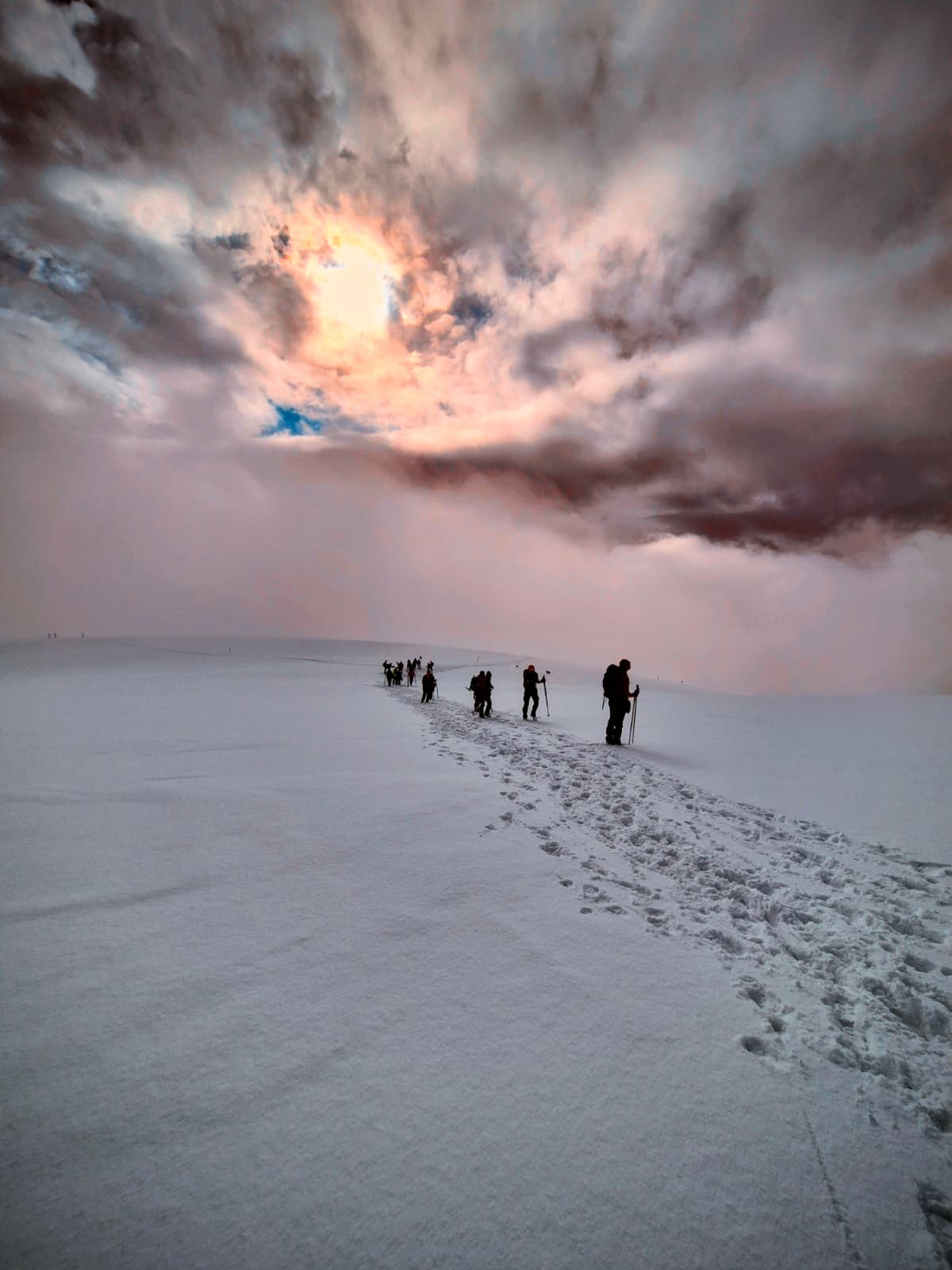 Cristi moved carefully ahead, guiding everyone along the icy ridge. Ana, his girlfriend and co-guide, walked close behind him, eyes sharp. She noticed the subtle shifts in the fog, the way the ridge seemed to breathe, almost watching their every step. “Cristi,” she murmured, “it’s not a joke. It’s… alive.”